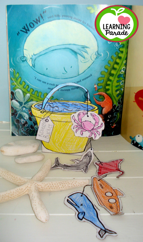 To help support story sequencing for Billy's Bucket, we've created this crafty story prop. Just print out the pdf template onto white card, colour and cut. We used embroidery thread to string together the underwater finds (help is needed to tie a little knot behind each, alternatively supply some tape) then we fed the pictures through the space when rereading or retelling the story!